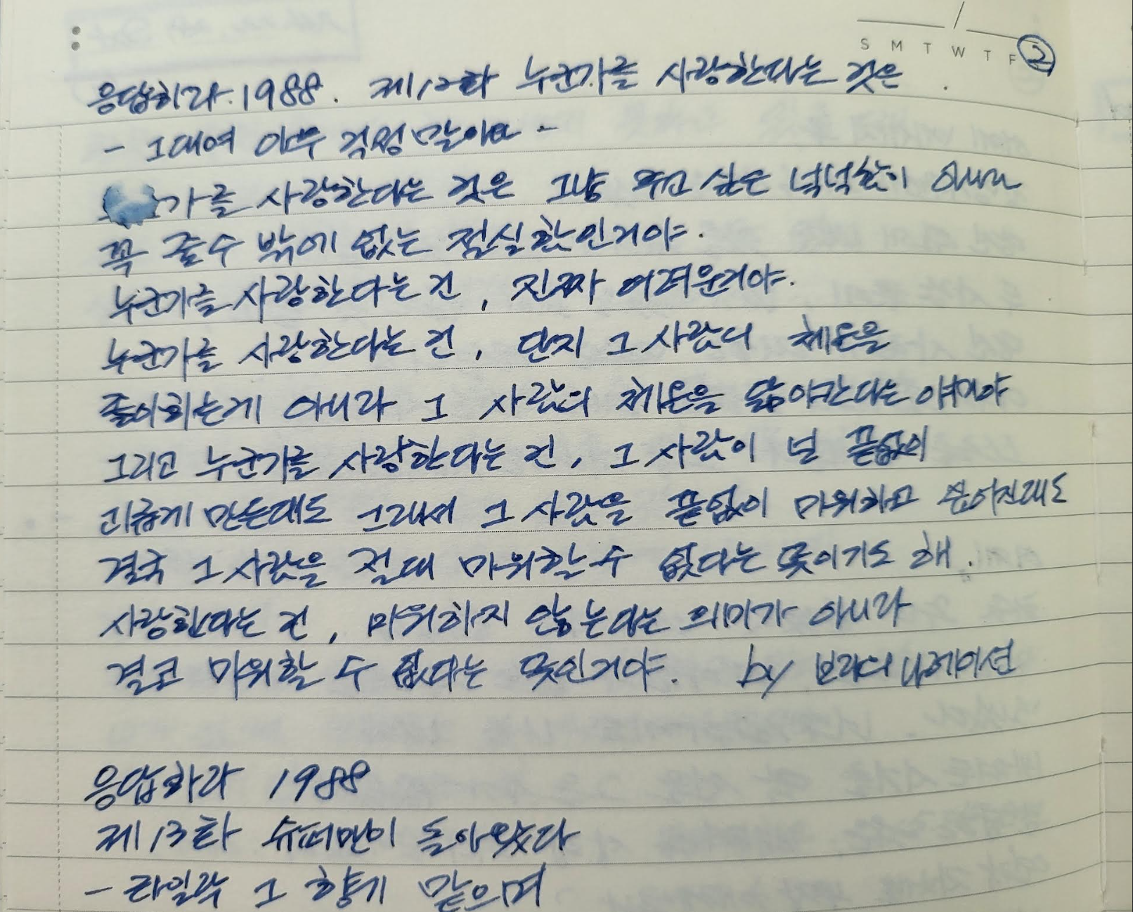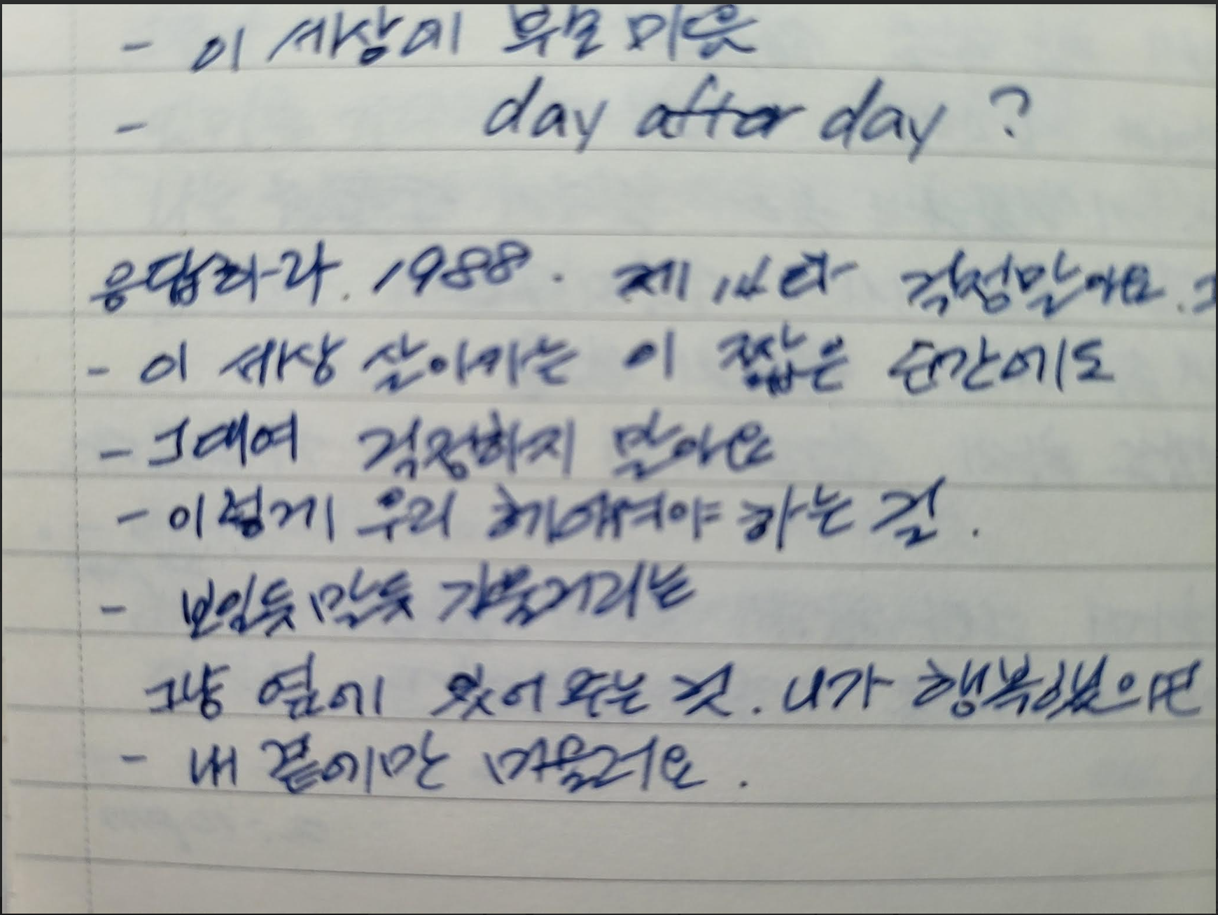 <응답하라 1988>이 ‘감성 레전드 드라마’로 불리는 이유 중 하나는 바로 OST와 명대사입니다. 주옥같은 삽입곡들이 매 장면의 감정을 배가시키며 7080 음악의 재발견을 이끌어냈습니다. 저의 경우는 빼곡히 노트를 할만큼 드라마에 나오는 대사들을 적어보기는 처음이었던 경험을 준 귀한 드라마입니다. 또한 노래 가사까지도 노트에 적을 적어볼만큼 특별한 감동을 준 드라마였습니다.